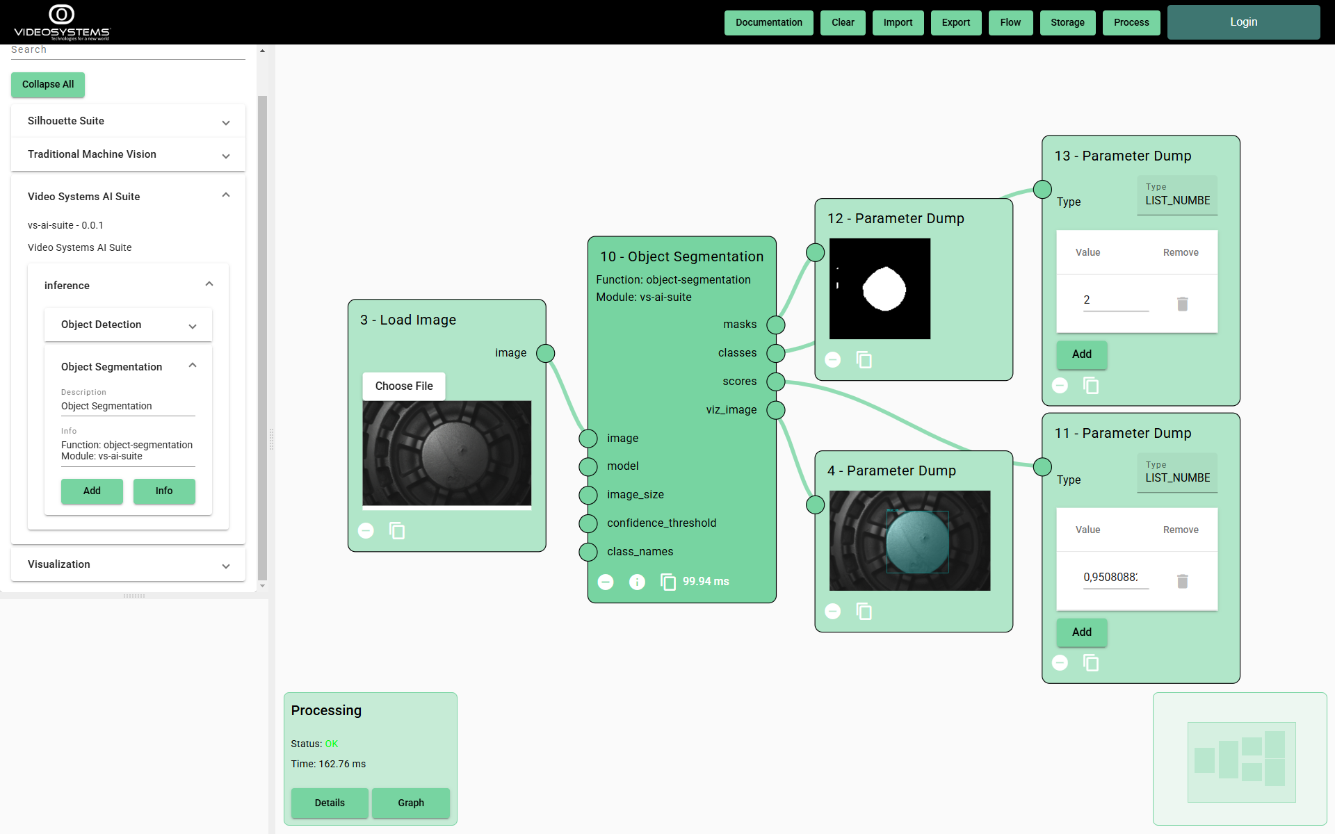 The Designer allows a developer to visually build Computer Vision algorithms, using the functions available in the different modules as designing blocks. This tool facilitates the development of an algorithm. The user can build a complex and specific flow including graphic debugging tools and relying upon the documentation of each module. It is particularly useful for pre-processing purposes, also considering that there is an infinite number of cameras and sensors in the market with various characteristics, and the environmental conditions are also a particularly key factor. This tool allows an algorithm to be tested so it is easy to check if the algorithm is stable or it needs to be tweaked. Besides traditional Machine Vision module implementing classical techniques and Contour Analysis module for profile extraction, measurement and comparison, also AI Inference modules can be used to include AI models, trained and tested relying on the AI Suite services presented in the section below.